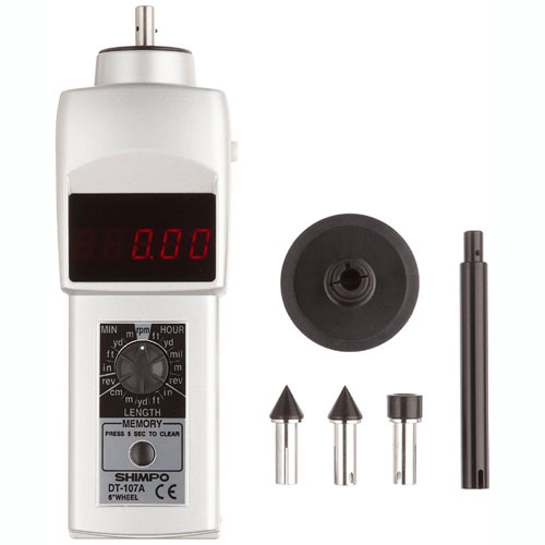 SHIMPOs microprocessor technology has heralded a superior standard in tachometer accuracy and capabilities for measuring and recording rotational/linear/surface speeds and total length. Offering unprecedented confidence via new improvements, the DT-105A and DT-107A battery-operated tachometers still feature the same rugged, high quality components that have made them the benchmark in the industry. These user-friendly, value-packed units feature expanded memory storage, added length functions, free N.I.S.T. certificate and many standard accessories.